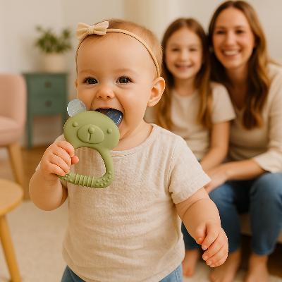 Pour les tout-petits (3-6 mois), découvrez notre Anneau de Dentition à Texture Stimulante, léger et facile à tenir. Sa surface texturée masse délicatement les gencives sensibles.
